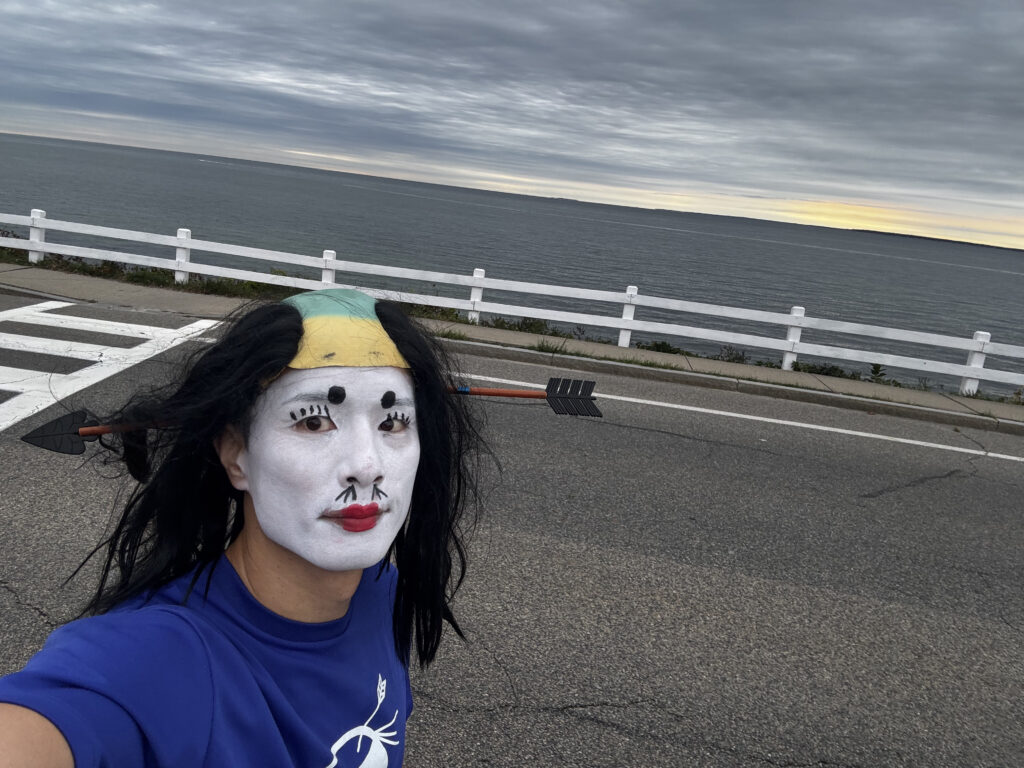マラソン大会当日、ホテルで落武者メイクを済ませスタート地点へ移動。